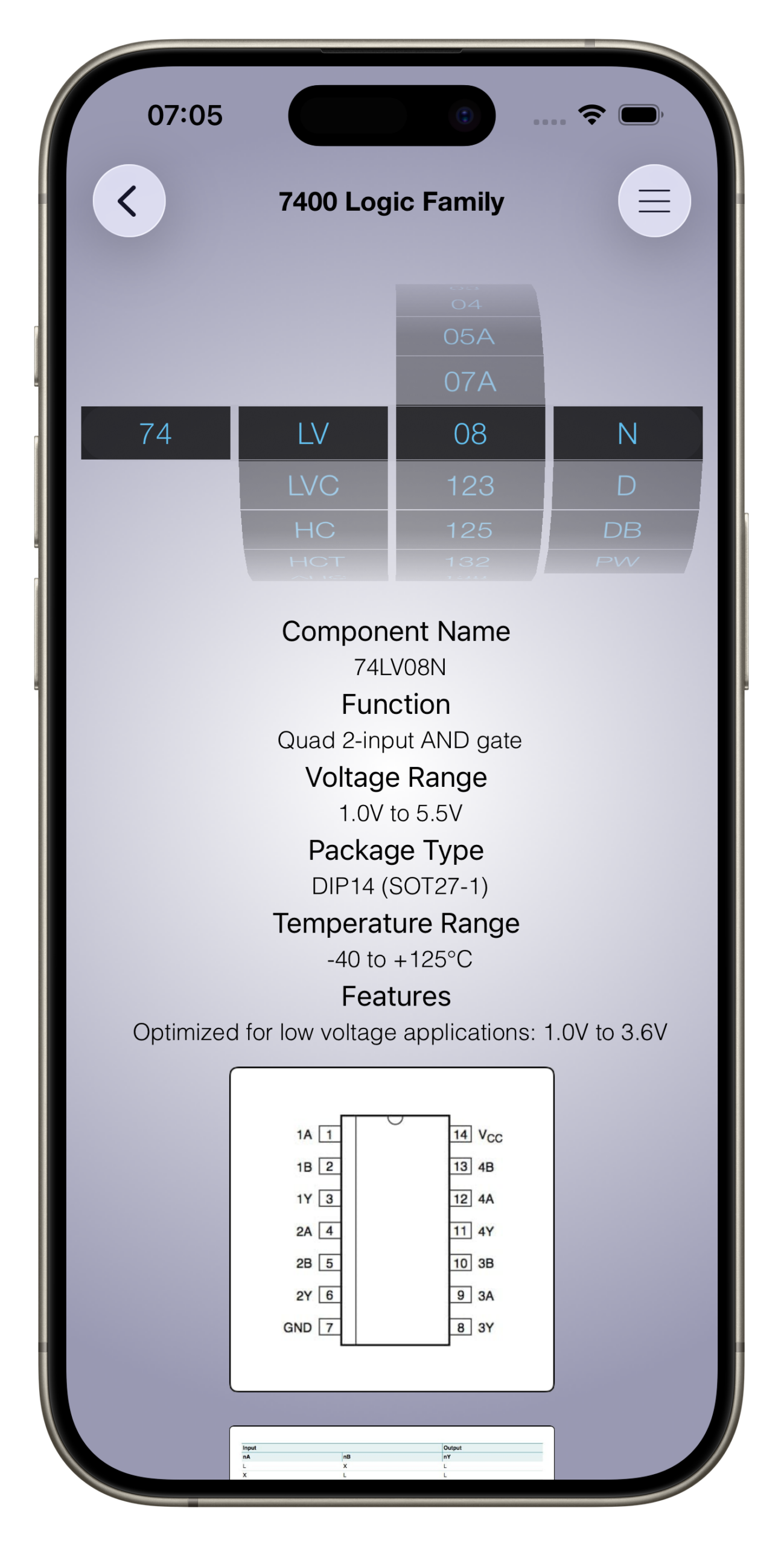 Extra large component reference section (incl. 7400 Series, PIC family, etc.) with the option to open pdf datasheets directly from within the App.